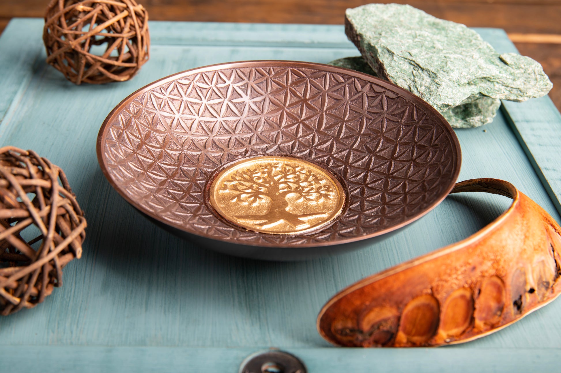 Große Räucherschale in antikem Look mit goldfarben geprägten Lebensbaum, auch "Yggdrasil" genannt, in der Mitte.